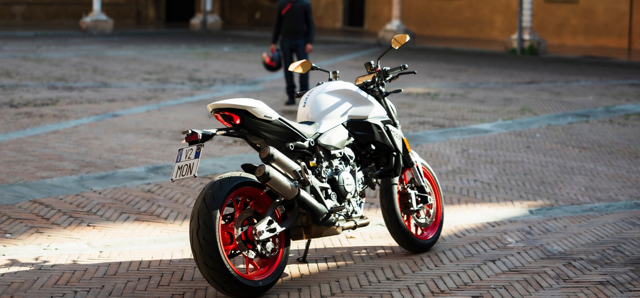Sports enthusiasts will also appreciate the homologated silencers with titanium liners and carbon end caps, developed in collaboration with Termignoni, which reduce weight (-0.2 kg) and unmistakably increase the Monster's grit.